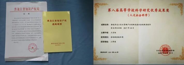 团队为黑龙江省等政府部门及企业制定的《省知识产权战略纲要(2010-2020)》《黑龙江省石墨烯产业三年专项行动计划2016-2018年》等规划、咨询和方法100多项,获省领导批示10余次;创建的“石墨烯产业创新发展政府推动模式”已在我省“3D打印”等战略性新兴产业推广应用。